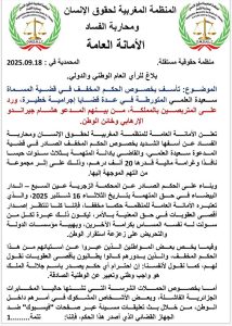 وفي الوقت نفسه، أدانت المنظمة بشدة ما وصفته بـ”الحملات الشرسة” التي تقودها المخابرات الجزائرية، إلى جانب بعض الأشخاص داخل الوطن، عبر شبكات التواصل الاجتماعي، للنيل من نزاهة القضاء المغربي، معتبرة هذه التحركات محاولات يائسة لضرب مؤسسات الدولة.