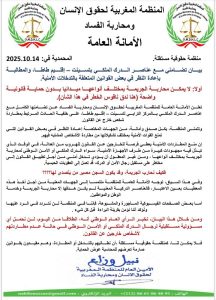 في بيان تضامني صدر اليوم الثلاثاء 14 أكتوبر 2025، أعلنت المنظمة المغربية لحقوق الإنسان ومحاربة الفساد عن تضامنها الكامل مع عناصر الدرك الملكي بالمركز الترابي تسينت – إقليم طاطا، وذلك على خلفية حادث مرتبط بمطاردة شخص خارج عن القانون،…
