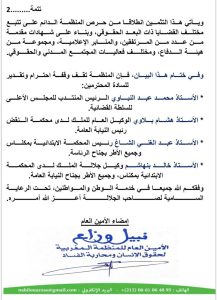 وفي ختام بيانها، وقفت المنظمة وقفة تقدير واحترام لعدد من الشخصيات القضائية، من بينهم الأستاذ محمد عبد النباوي، الرئيس المنتدب للمجلس الأعلى للسلطة القضائية، والأستاذ هشام بلاوي، الوكيل العام للملك لدى محكمة النقض ورئيس النيابة العامة، إضافة إلى الأستاذ عبد الغني الشاغ، رئيس المحكمة الابتدائية بمكناس، والأستاذ خالد بنهاشم، وكيل جلالة الملك لدى المحكمة نفسها، وجميع الأطر العاملة بالمحكمة.