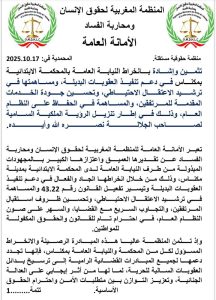 أصدرت الأمانة العامة للمنظمة المغربية لحقوق الإنسان ومحاربة الفساد، يوم الجمعة 17 أكتوبر 2025، بيانا ثمنت فيه المجهودات الجادة والمتميزة التي تبذلها النيابة العامة لدى المحكمة الابتدائية بمدينة مكناس، وذلك في إطار دعم تنفيذ العقوبات البديلة والمساهمة الفعالة في ترشيد الاعتقال الاحتياطي، انسجامًا مع التوجيهات الملكية السامية لصاحب الجلالة الملك محمد السادس نصره الله وأيده، الرامية إلى تحديث المنظومة القضائية وتعزيز مبادئ العدالة والكرامة الإنسانية.