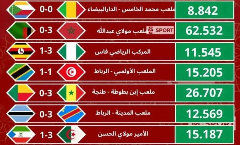 وأعلى حضور جماهيري ، عرفته مباراة المغرب ضد زامبيا بملعب مولاي عبدالله بالعاصمة الرباط،