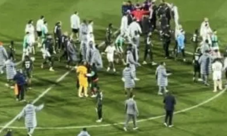 ولم تتوقف الأحداث عند المدرجات، حيث شهدت الدقائق الأخيرة من اللقاء ومباشرة بعد صافرة النهاية احتكاكات حادة بين لاعبي المنتخبين، تطورت إلى شجار محدود داخل أرضية الملعب، قبل أن يتدخل الطاقم التحكيمي والأطقم التقنية للفصل بين الطرفين.